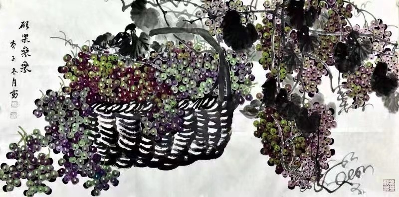 整幅图于浑朴中见清秀,于洒脱中含缜密,于酣畅中寓意蕴,显示了娴熟的技法。几幅葡萄作品,是作者最擅长的画作,更显别具一格,独家风韵。画风清新雅丽,笔墨浓淡适宜,用笔极其灵妙,把一串串色彩不一、鲜嫩水灵的葡萄勾画的玲珑多姿,真实自然,颗颗饱满圆润,粒粒晶莹闪亮,青绿色的似翡翠,紫红色的像玛瑙,紫黑色的更像闪亮的黑珍珠,看这些葡萄真让人垂涎欲滴,也让人不禁想起“一架葡萄满院香“,”藤牵硕果任君尝“的优美诗句。笔者在欣赏《葡萄丰收》时,曾入神地看着那一篮晶莹剔透的葡萄进入一种忘我的境界,情不自禁地为画配诗一首:一篮葡萄溢彩鲜,满盘玉珠失光艳,秀色未餐心已甜,出神入化口觉干。