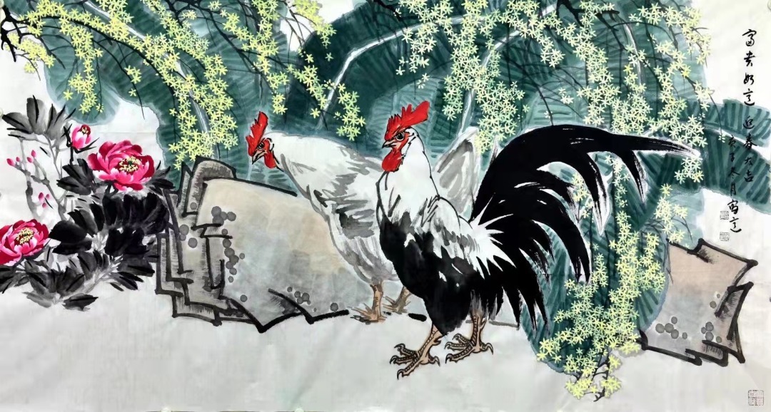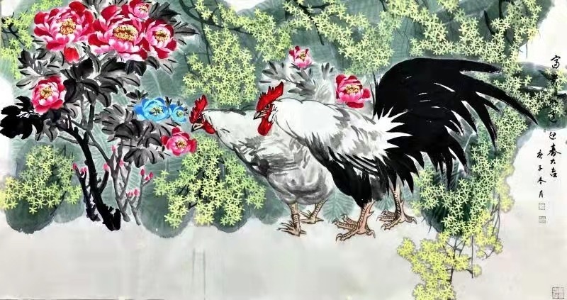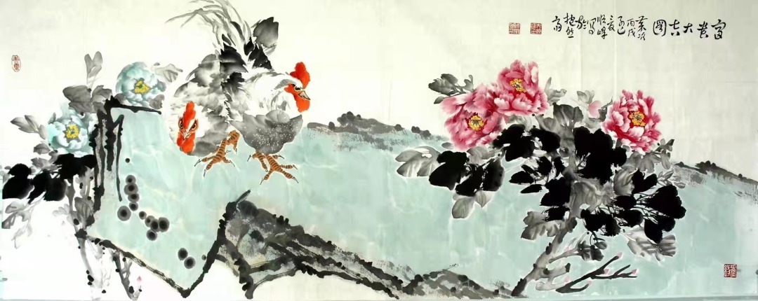 作品立意新颖,韵味悠长,蕴藏着劳动者的辛勤耕耘和对丰收的喜悦,洋溢着对劳动者的赞美和歌颂,从而也体现了作者对劳动人民的无限热爱并充满了真挚感情。《富贵平安》、《富贵吉祥图》两幅作品,用笔恣肆,设色清新,尽显典雅端庄大气、洒脱自然的艺术风格。牡丹是富贵的象征,画家笔下的牡丹花有红色、粉色、紫色、绿色,争妍斗丽,妩媚迷人,让观赏者不仅领料了国色天香的风姿,更增添了对生活的无比热爱之情。欣然作诗,以抒情怀:牡丹花开冠群芳,姹紫嫣红映朝阳,赏过牡丹不看花,只享富贵与吉祥。