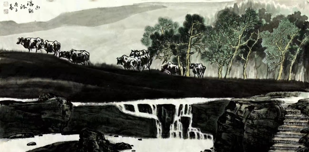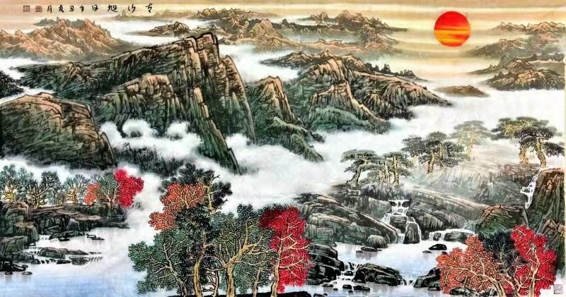 再看其山水作品,设色多青绿重彩,间施浅降;气韵生动,笔墨干湿浓淡相宜,虚实变化丰富,追求色与墨、点与线、勾勒与皴染的变化与统一,用笔灵动圆润,用墨浑厚;构图气势宏伟,苍茫浑厚,意境优美,情趣盎然,极富神韵;画面层次分明,远景飘渺,近景厚实,立体感强,传神逼真,给人一种来源于自然的生机和美感,一种天人合一、情景交融的意境,具有极强的艺术感染力,体现了画家深厚的绘画功力、文化修养和很高的艺术水准,也彰显了作者热爱大自然、热爱祖国大好河山的高尚情怀。《太行春韵》、《太行松风》、《白云深处有人家》、山高水长春常在》等画作,构图雄伟壮观,气势磅礴,笔墨苍劲,层次丰富,画中峰峦叠嶂,松石挺秀,山、水、云雾等景物布置得当、疏密有致。